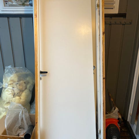 Scanflex Sindre bomull hvit innerdør i tre med tre rektangulære speil. Uten dørvrider og nøkkelskilt. Det er noen minimale skader i bunn av døra. Den er saget av ca 1 cm i bunn, bør være OK om en likevel skal ha åpning for ventilasjon. Nypris ca. 2500 for bare dørbladet. For 90x210 dørkarm, er uten karm. Dette fås f.eks. på Tore Ligaard.