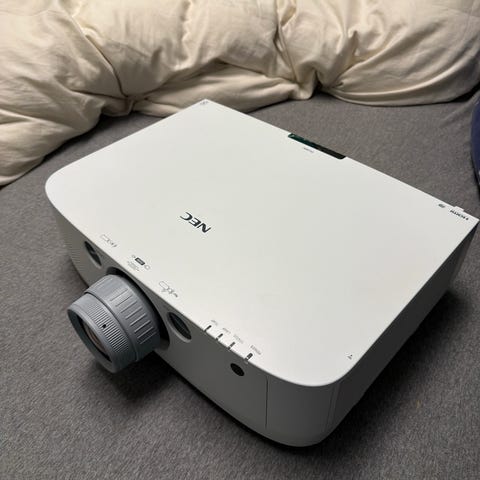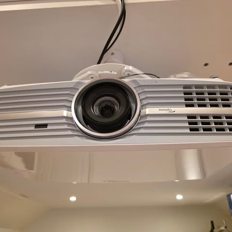 Dette er en Short throw projektor, som ikke må henge langt ifra lerret.