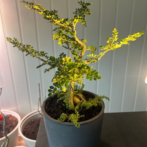 Bonsai plante med grønt løv og en vridd, dekorativ stamme. Planten er plassert i en gullfarget potte med hvite dekorative steiner. Egnet for innendørs bruk som dekorasjon. Potte og dekor følger ikke med