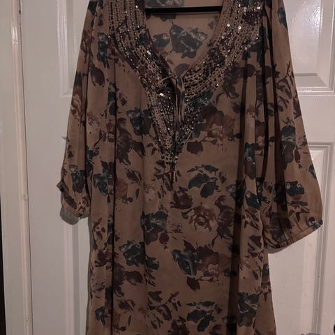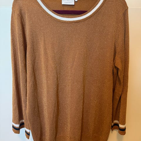 Pen topp! Blå med glitter og striper, litt opphøyet hals, pen til både bukse og skjørt.