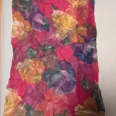 Fargerikt skjarf laget av lett, delvis gjennomsiktig glatt stoff som ikke klør.