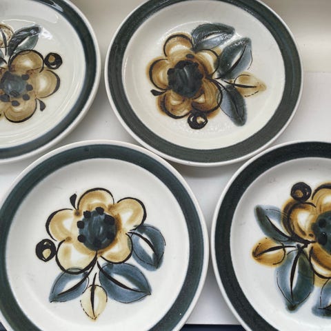 De er alle hele og pene i rustfritt stål med teakskaft. De er brukt, så bruksmerker må påberegnes, spesielt på ståldelen.