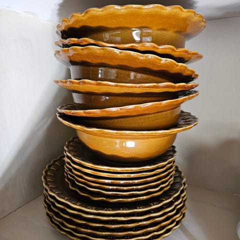 Bordallo Pinheiro keramisk servise sett i oker farge. Inkluderer kopper, små og store tallerkener med dekorative kanter. Passer til servering av mat og drikke.