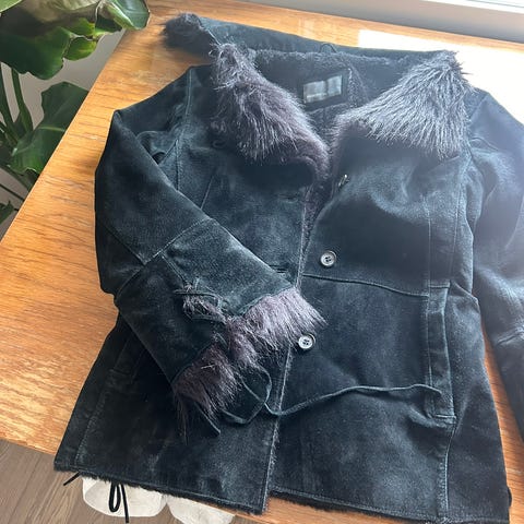 Unik og fin semsket skinnjakke med pels på hele innsiden, rundt kragen, langs kantene og armer. Kjempe behagelig jakke som varmer godt. Pelsen er av rev og mink