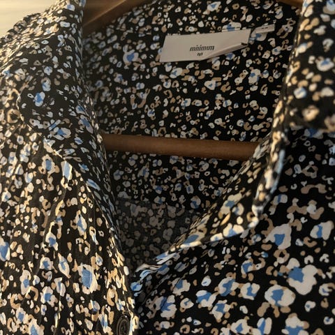 Størrelse 44. Normale eller litt liten/kort? i størrelsen. Knapper ned til strammesnor i livet. Knapper nede på mansjettene på armene.