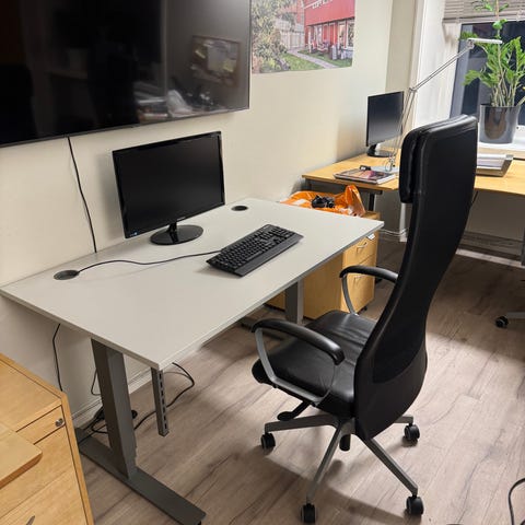 Jysk skrivebord i tre med flere skuffer og hyller. Skrivebordet har en fin trefarge og hvit på skuffene og tilbyr god oppbevaringsplass. Passer til kontor eller arbeidsrom.