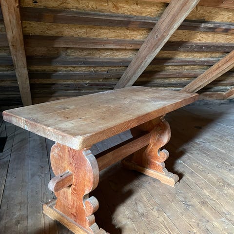 Gammel gymbenk selges. Benken har en lang, smal form og viser naturlige bruksspor og patina. Egnet for innendørs eller utendørs bruk der en enkel sitteplass er ønsket. Fin også som pynt med bøker og bilder, eller for avlastning i en gang, stue etc. Den er også brukt som TV benk.