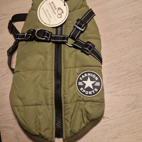 Det er en vintervest i fleece med innebygd sele, designet for å holde hunden varm i kaldt vær.