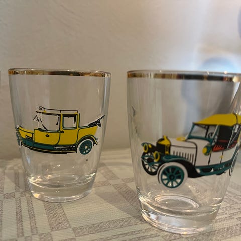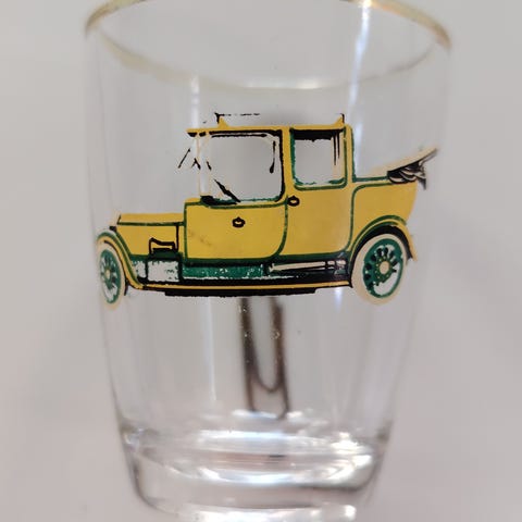 Umage Schnappsglass sett med dekorative motiver i glass. Settet består av flere små glass med ulike fargerike og detaljerte motiver, inkludert biler og frukt. Glassene har en gullfarget kant øverst. Egnet for servering av små mengder drikke. Noen av glassene har slitt gullkant.