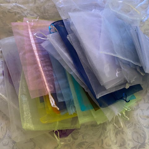 50 stk nye, ubrukte poser i organza selges samlet. Tilsvarende selges på Panduro for 130 kr for 10 stk.