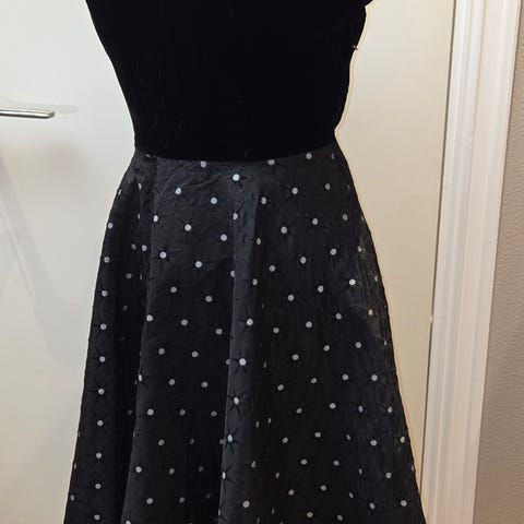 Feminin kjolen fra 60tallet. Skrddersyd, ingen merkelapp. Str. trolig 38. Svart stoff, med fløyelses pynt og perler. Fin perlerand på halsen. Glidelås på baksiden. Den kommer med tyllskjørt, slik at kjolen står pent ut.