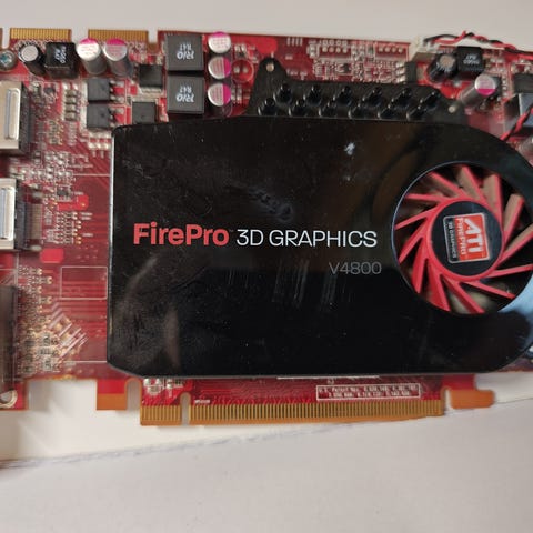 AMD FirePro V3900 Tilleggsutstyr for datamaskin. Grafikkort med en kombinasjon av DisplayPort og DVI-tilkoblinger. Rødt kretskort med integrert vifte for kjøling. Retro PC evt. bud