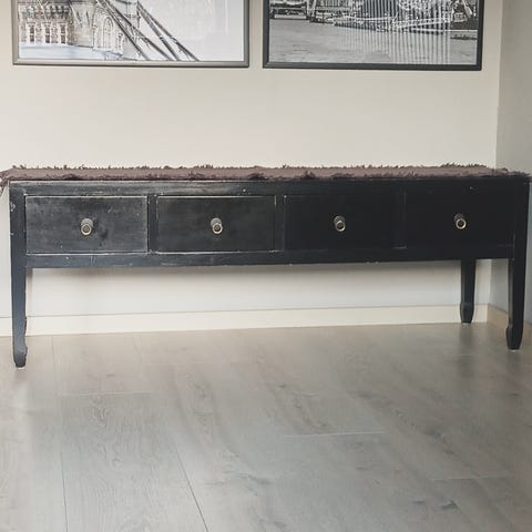 Selger en stilig sort kommode av solid kvalitet. Kommoden har stått i gangen og kun vært brukt til enkel oppbevaring. Inneholder 3 romslige skap (med to hyller), samt 3 skuffer. Fremstår gammeldags i stilen. Kan hentes på Klepp.