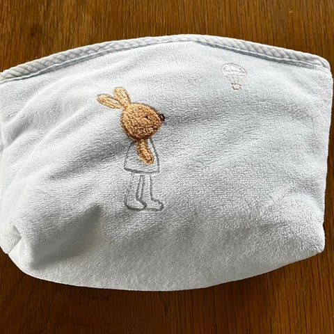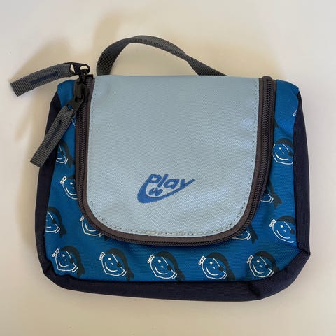Gul toalettveske med svart innside og flere lommer. Vesken har navnet Liam brodert på forsiden. Egnet for oppbevaring av små eiendeler og enkel transport.