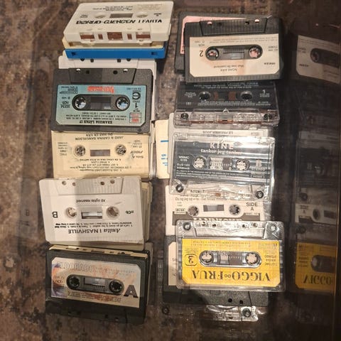Pakke med 48 kassettbånd i ulike farger og merker. Kassettbåndene er lagret i en plastboks for oppbevaring. Passer til kassettspillere for avspilling og innspilling av lyd.