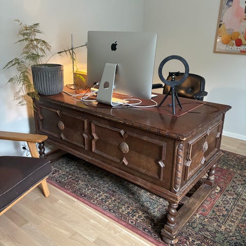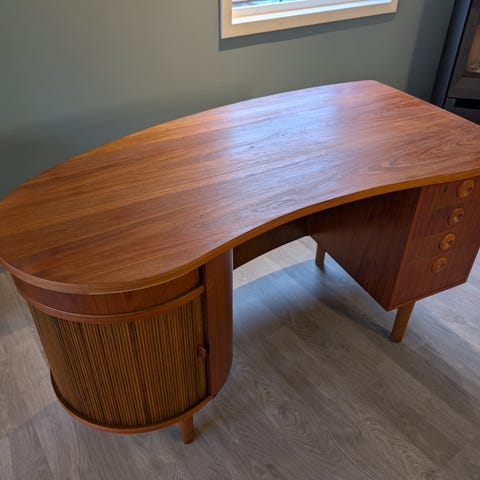 Stort robust skrivebord , trolig lagd av gml teak (?)