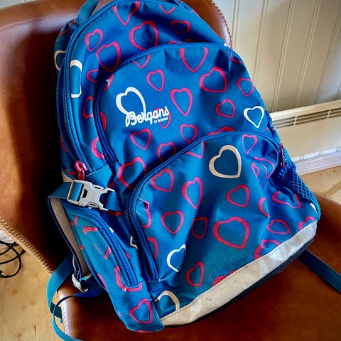 Bergans barn ryggsekk med bærestativ i rød og blå farge. Designet for bæring av barn med polstrede skulderstropper og hoftebelte for komfort og støtte. Bærestativet gir stabilitet og mulighet for å sette ryggsekken ned når den ikke bæres. Må hentes koster 100kr