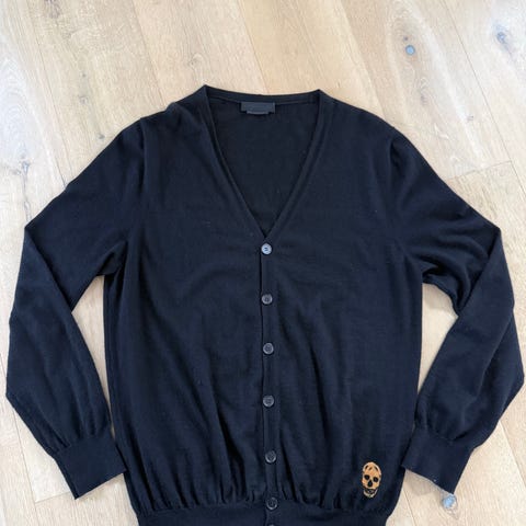 Svart cardigan fra Jack & Jones. 45 % akryl, 35 % bomull og 20 % nylon. Str. XXL men er litt liten i størrelsen så passer best en XL.
