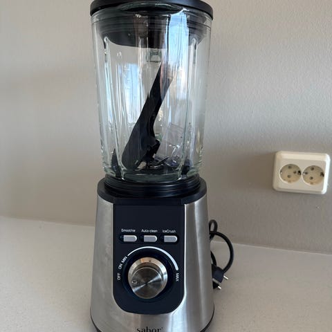 Saber Blender med stål og svart farge. Utstyrt med flere funksjonsknapper og justerbar hastighetskontroll via dreiebryter. Egnet for ulike matlagingsoppgaver som miksing og blending.