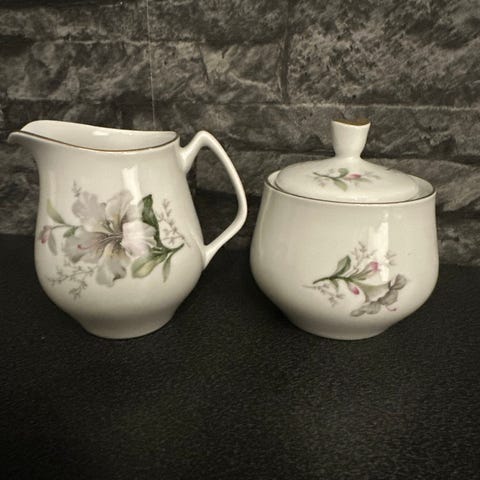 Selger et nydelig og komplett sett bestående av fløtemugge og sukkerskål med lokk fra den anerkjente Porsgrunds Porselænsfabrik (PP).