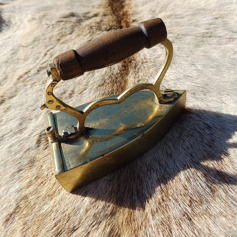 Et gammelt strykejern i messing som er 12 cm høyt og 16 cm langt. Det er åpning bak hvor det kan has i varmt kull til oppvarming. Det er gravert M S D på siden.