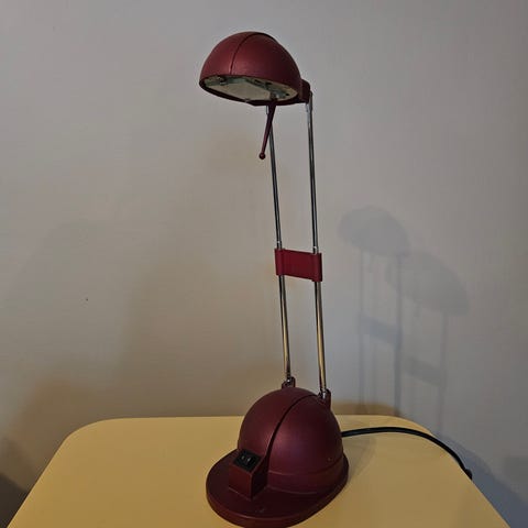 Stilig og tidlaus raud skrivebordslampe med retro preg. Lampa har fleksibel metallhals som gjer det enkelt å rette lyset dit du treng det, anten det er til lesing, arbeid eller som stemningslys.