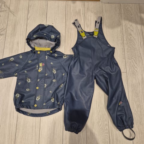 Regnjakke og regnbukse fra kattnakken str 98 selges sammen med tilhørende sydvest.