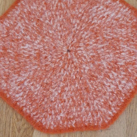 Sitteunderlag strikket i ull. Tykt og godt å sitte på. Øynene er bare festet på ene siden så de ser litt løs ut, men sitter godt fast.