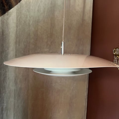 Stilig retro pendel fra 70–80-tallet med klassisk flerskjermsdesign som gir mykt og blendefritt lys. Lampen har en hvit metallskjerm med rosa kant og et originalt heisoppheng, slik at den enkelt kan heises opp og ned etter behov – perfekt over spisebord eller i stuen.