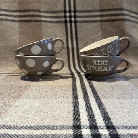 2 mørkegrå Bastion Collection kopp og skål. Koppen har et hvitt hjerte på utsiden og er hvit inni. Skålen har bølgete kanter og matcher koppen i farge og materiale. Fremstår som nye.