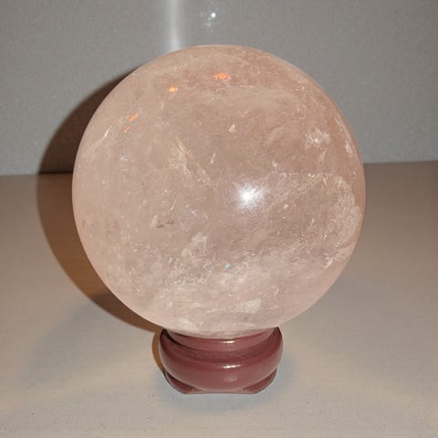 Clear Quartz krystall kule (sphere). Den er ca. 8 cm og 708 gr. Holder medfølger: