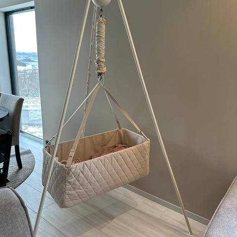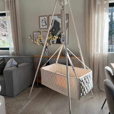 Medfølger: to tisselaken, tre laken, avstiverbunn, madrass og klype til å henge i taket, vuggemotor, fjør