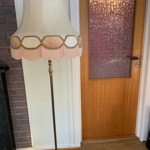 126 cm høy. Dreid trefot, herlig stor lampeskjerm. Veldig godt bevart. Ingen skader, ingen slitasjer ,ikke solbleket, fargene er fortsatt rene og kraftige. Ujordet kontakt. Bør hentes.