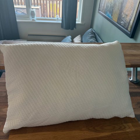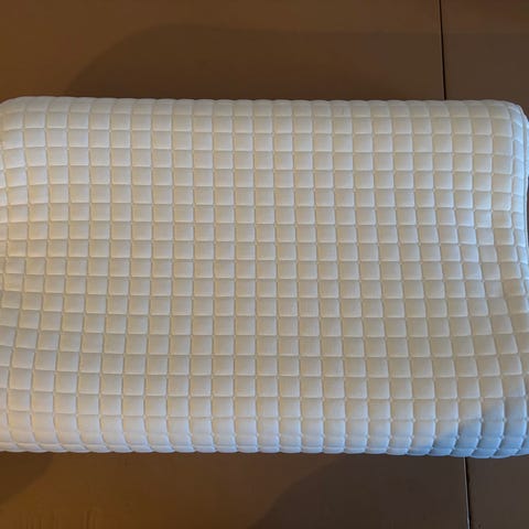 Selger denne ergonomiske puten med biter av memory foam. Den skal tilpasse seg hodeform og nakke, og gi god støtte når du sover. Puten skal også være kjølende, fordi varm luft forsvinner mellom bitene. Størrelse 50x60 cm, vaskbar på 60 grader. Den er som ny og har et behagelig, solid trekk med glidelås.