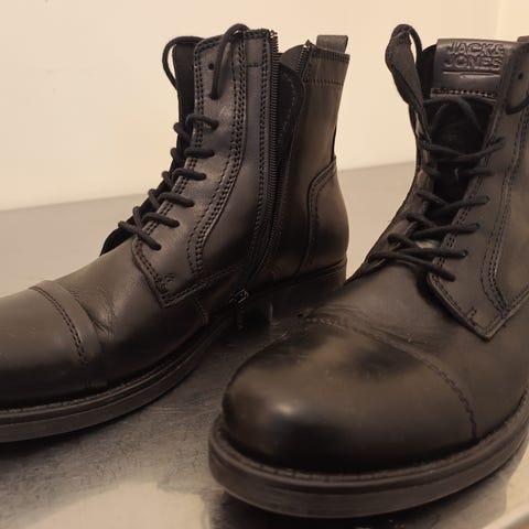Ekte skinn, snøring foran for regulering og glidelås på innsiden.