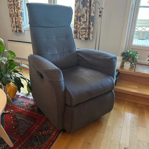 Selger ein svært komfortabel lenestol med varme i rygg og sete. Kjøpt ny på fagmøbler for ca 2 mnd siden. Stolen kan justere både rygg og bein så ein nesten får flat liggestilling. I tillegg kan den heises opp dersom ein treng hjelp til å reise seg. Ny pris på fagmøbler ca 23.000.