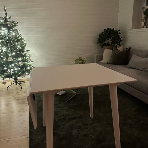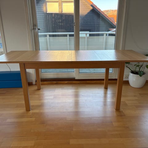 Selger et fint bord med mål 90x90cm med to klaffer som hver er 40 cm bred. Totalt kan bordet bli 170 cm langt.