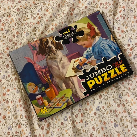 Play Now Puzzle med 1000 biter, størrelse 44 x 68 cm. Puslespillet viser et høstlandskap med et hus og en sjø, produsert i USA.