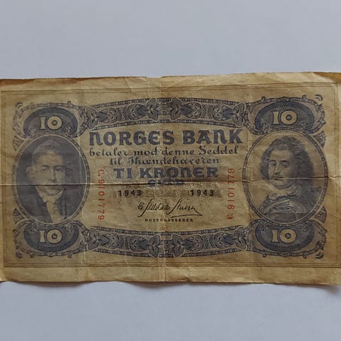 Danmark 10 Kroner sedler utstedt i 1945. Sedlene har detaljerte trykk og er fra Danmarks Nationalbank.