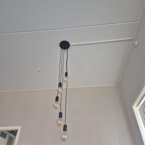 Jeg selger en Ellos Cooper svart/krom/smoke pendel-lampe som er fin over spisebord eller over sofagruppe. Denne selges til en svært god pris, da ledning er tvinnet, det går sikkert å få tredd om, slik at det blir riktig. Gir rikelig og pent lys, og kan dimmes. Fungerer som den skal. Pris for ny lampe hos Ellos er 3.299,-.
