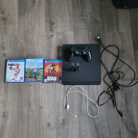 Sony PlayStation 4 spillkonsoll med to trådløse kontrollere og en ladekabel. Strømkabel og HDMI kabel medfølger. Inkluderer 8 spill: Spider-Man, Gran Turismo Sport, Sniper Elite 4, Diablo III, Diablo 4, Red Dead Redemption 2, Far Cry 4, og The Last of Us Part II.
