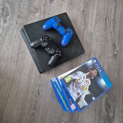 PlayStation 4 spillkonsoll med 2 kontroller og 8 spill
