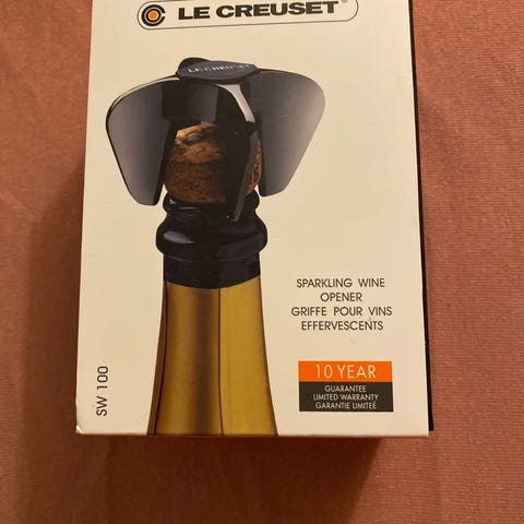 Champagneåpner fra Le Creuset. Denne vinåpneren sørger for at flasken åpnes trygt og stilig. Bare plasser armene i sporene på flasken og vri håndleddet for å åpne slik at du kan nyte de friske boblene