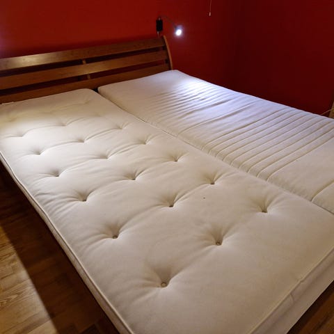Hvit dobbeltseng med pen avslutning i hodeenden. Sengebunn i tre. To støtteben under midten.