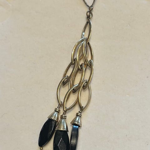 Vakkert halskjede som henger pent. Med Rav. Lengden er 30cm fra lås til vinkelen på smykket. Sølvkjedet måler 54cm