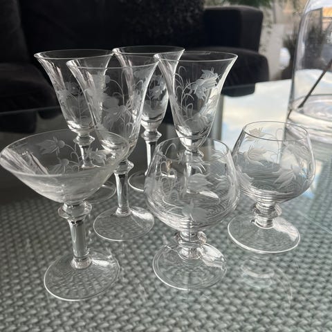 Diverse glass, mugge, karaffel fra BlåklokkeKrosno. . 6 stk Rødvin høye, 8 stk små rødvin/øl glass, 3 stk Hvitvin, 4 stk Longdrink/vann, 4 stk desserskål, 1 stk likør, 6 stk Vann, 2 stk drink glass. 1 vannmugge, 1 karaffel, 1 vase. Selges samlet 1500,-kr eller bud. Pris kan og diskuteres