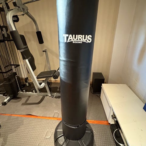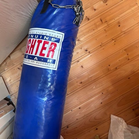 Selger mannens boksesekk, den er oppbevart inne, men har dessverre ikke hengt oppe på evigheter, og mtp takhøyde i kjeller og innredning i resten av huset, er den nok historie😬🤭