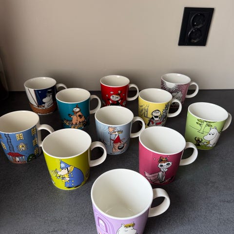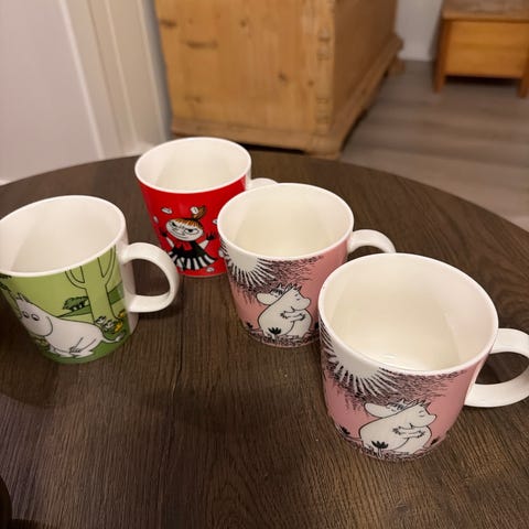 Arabia Mummitrollet kopper. Pent brukt. Selges for 180kr stykk. Se bildet for minimale bruksmerker på den grønne snusmumrikken og den mørkerosa lille my.