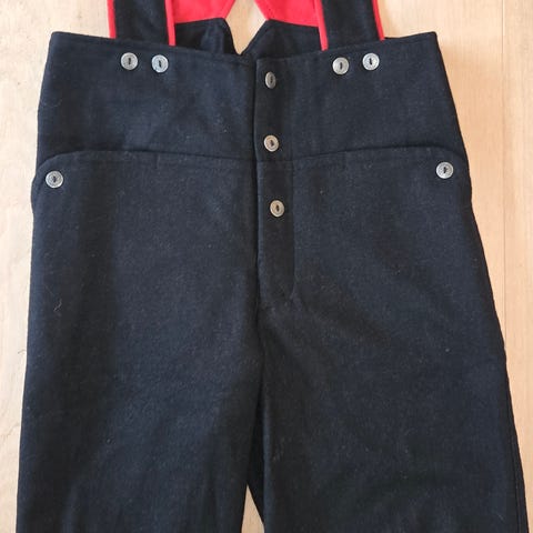 Festrakt gutt, størrelse 1-2 år . Knebukse i vadmel( 40 cm lang fra liv,bred strikk i livet, omkrets 56 cm, strikk under kne, 6 knapper) vest, ullstoff kjøpt på Heimen, 5 knapper (omkrets 75 cm, høyde 34)Vesten foret.