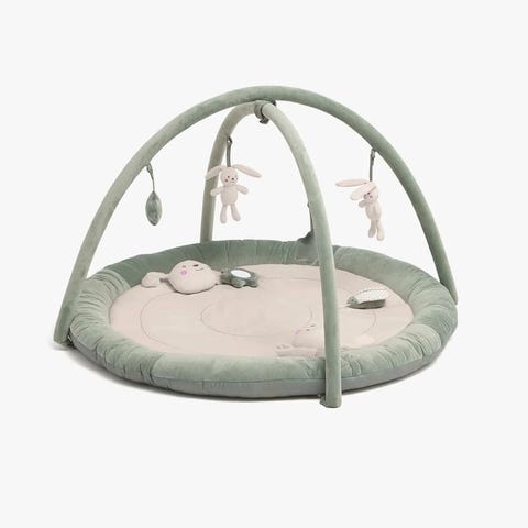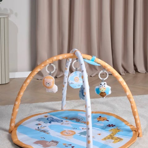 Babygymmen har et mykt underlag med trykk av ugler og inkluderer oppheng for leker.